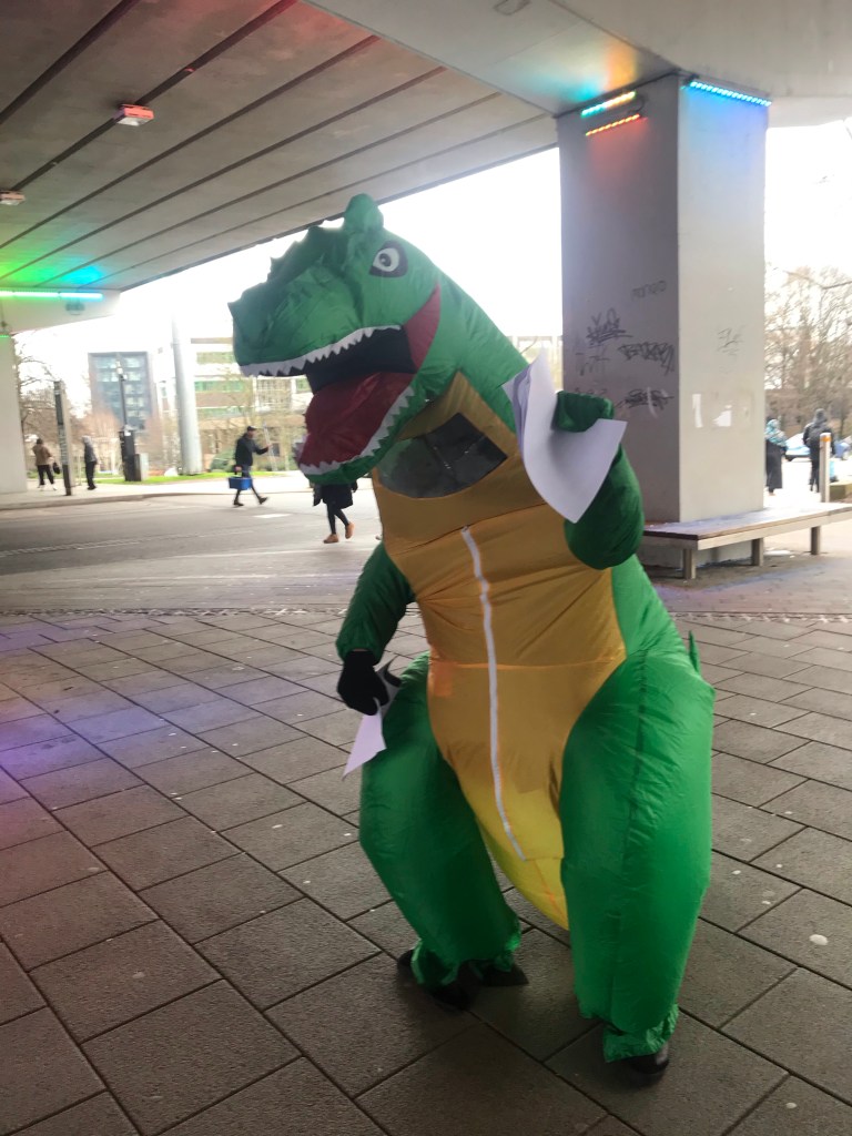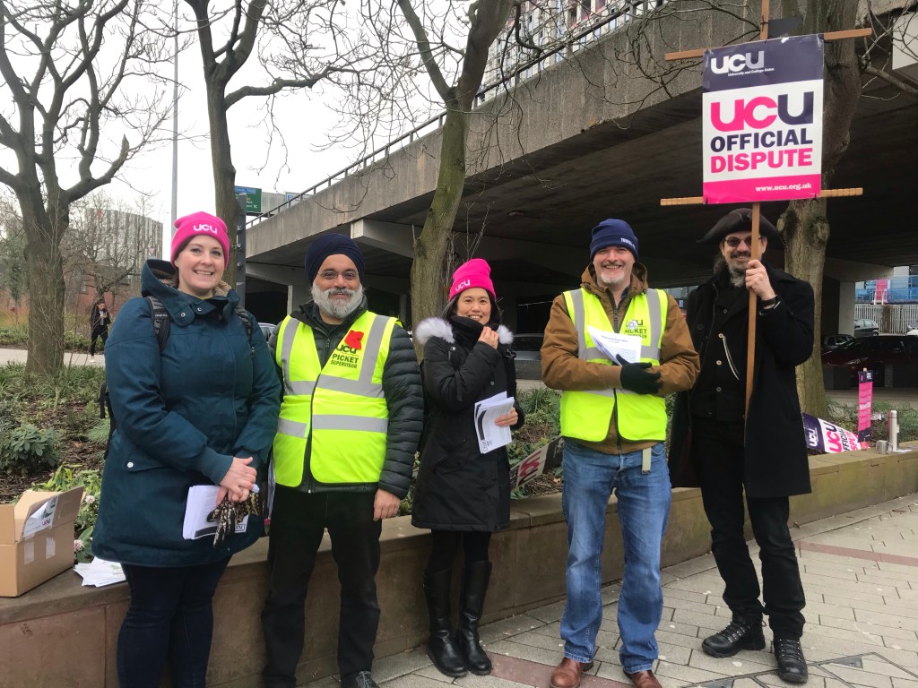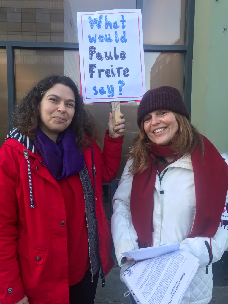 The Dino of Defiance Strikes!!!On the Picket LineWe had lots of really good discussions with students today and throughout our dispute. What’s clear to us is that is that as a teaching trade union we have a lot in common with students, and that many of them can see the way they are constructed as ‘consumers’ of education distorts the real purpose of education. Paulo Freire is a founding figure of “Critical Pedagogy”, an educational philosophy that calls for critical as opposed to the instrumental education promoted in today’s marketised university. For the new breed of highly paid Senior Managers and Faculty Deans, scoring good results in student satisfaction league tables is far more important than the substance of what we actually teach. Paulo Freire would probably say if we care about education we need to fight this!