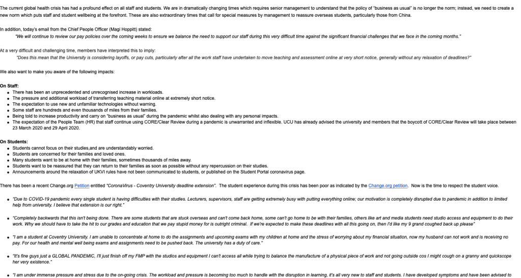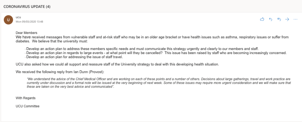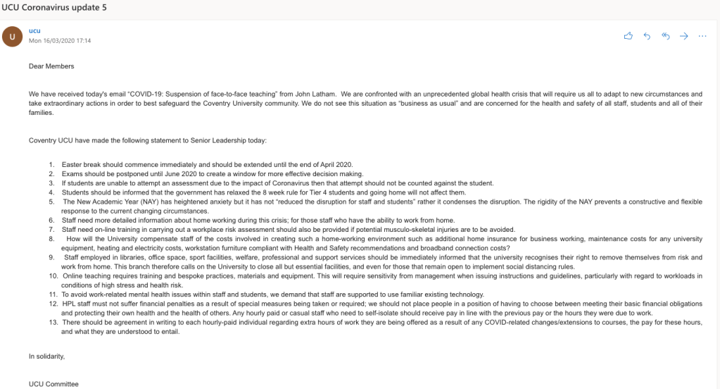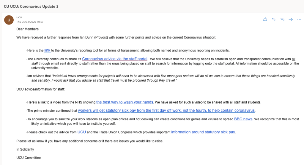 Curious about what the Branch has been advocating on the behalf of members and all Coventry University staff around coronavirus?