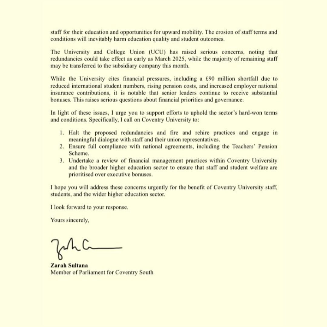 Zarah Sultana MP Coventry South writes to VC 7th January 2025 Proposed Redundancies and Fire and Rehire Practices at Coventry University Share this: Click to share on X (Opens in new window) X Click to share on Facebook (Opens in new window) Facebook Like Loading...